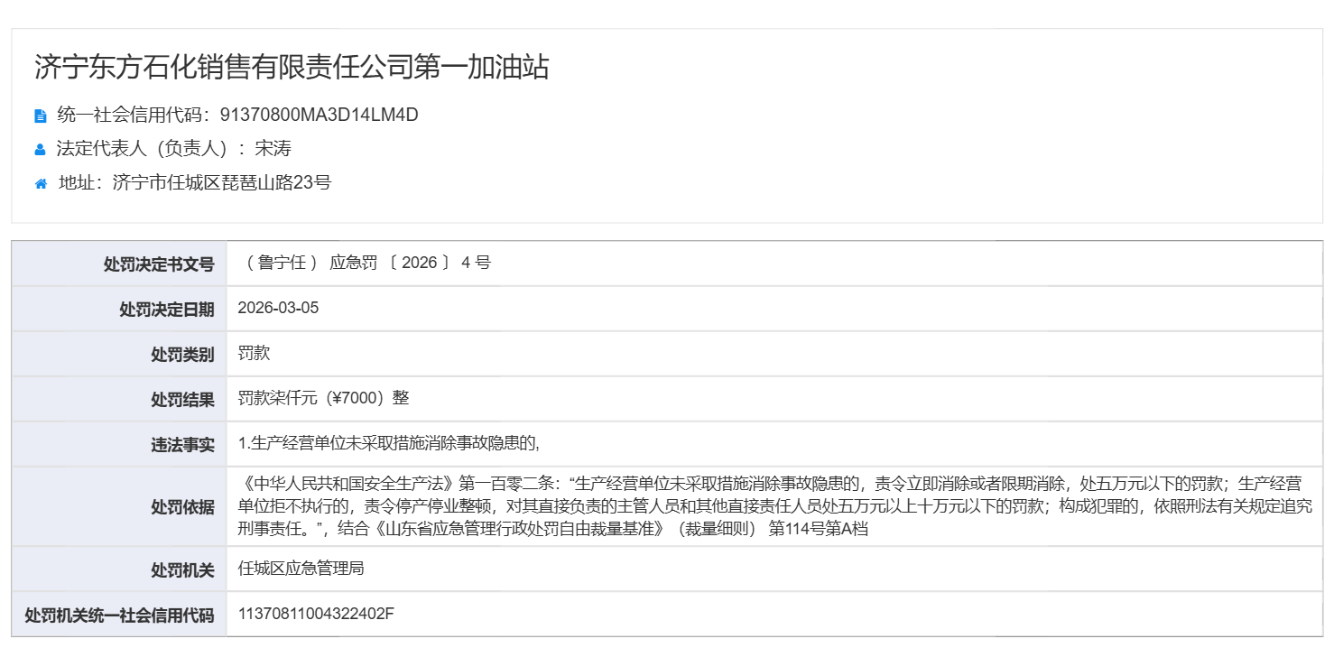 从山东省应急管理厅官方网站了解到,日前,济宁东方石化销售有限责任公司第一加油站因存在生产经营单位未采取措施消除事故隐患的违法事实,依据《中华人民共和国安全生产法》第一百零二条:“生产经营单位未采取措施消除事故隐患的,责令立即消除或者限期消除,处五万元以下的罚款;生产经营处罚依据单位拒不执行的,责令停产停业整顿,对其直接负责的主管人员和其他直接责任人员处五万元以上十万元以下的罚款;构成犯罪的,依照刑法有关规定追究刑事责任。”结合《山东省应急管理行政处罚自由裁量基准》(裁量细则)第114号第A档,被济宁市任城区应急管理局罚款7000元。