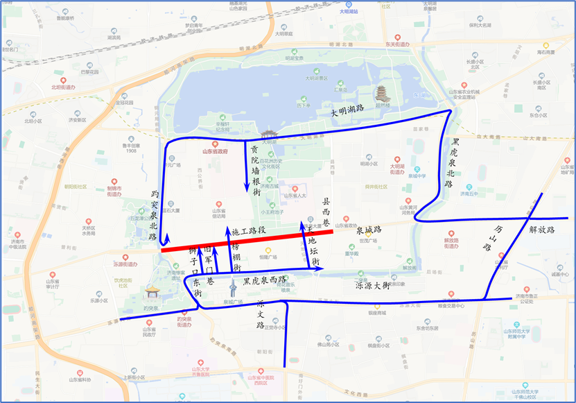 机动车绕行路线:过境车辆绕行路线1:自历山路绕行至泺源大街;过境车辆绕行路线2:自黑虎泉北路绕行至明湖北路;过境车辆绕行路线3:自县西巷绕行至大明湖路。