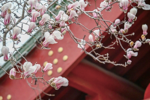在迎春花铺就的金色底色之上,济南的春日顶流玉兰花悄然绽放,白瓣素雅、紫蕊温婉,一朵朵绽放在古建旁、湖水边、闹市中,与济南的泉韵湖光相融,勾勒出独一份的春日浪漫。