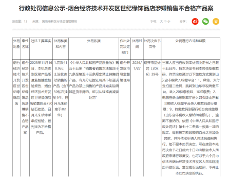 除了消费者投诉,世纪缘珠宝旗下门店还因产品质量问题受到了市场监管部门的正式处罚。记者从烟台黄渤海新区市场监督管理局获悉,烟台经济技术开发区世纪缘饰品店因销售不合格产品,于2026年1月27日被处以行政处罚。