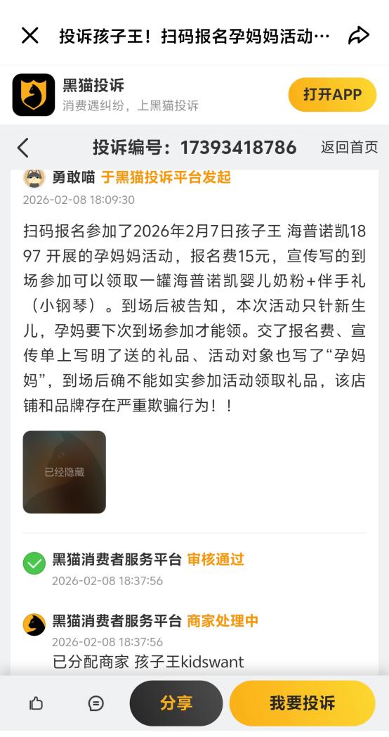 据黑猫投诉平台2026年2月8日消息,用户报名参加了孩子王门店与海普诺凯1897联合开展的孕妈妈活动。活动宣传显示,报名费15元,到场可领取一罐海普诺凯婴儿奶粉及伴手礼,活动对象明确写着“孕妈妈”,结果现场被告知本次活动只针对新生儿,孕妈下次到场才能领礼品。该消费者认为,存在活动宣传不实、诱导参与嫌疑,感觉受到消费欺骗。