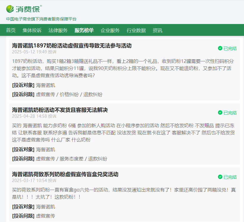 近期,本站通过国家市场监管总局公众留言平台、消费保、黑猫投诉等公开渠道监测发现,海普诺凯品牌在近一年来出现多起消费者投诉。投诉主要集中在奶粉异物、促销活动规则不清等问题。作为备受欢迎的婴幼儿奶粉品牌,这些投诉无疑给正在选择奶粉的家长们提了个醒。记者对此进行了梳理,希望能帮助家长在选购奶粉及参与商家活动时多一份考量。