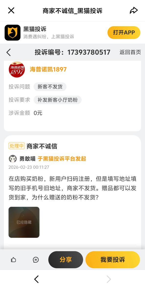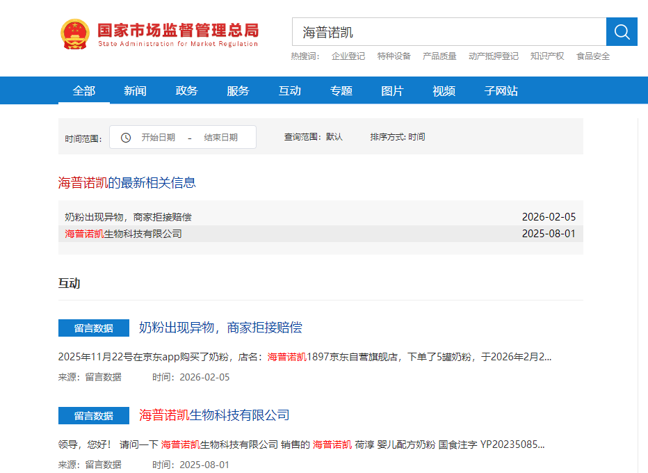 食品安全是奶粉的底线,也是最牵动家长神经的问题。2026年2月5日,有消费者通过国家市场监管总局公众留言平台反映,在线上平台购买的海普诺凯奶粉出现异物,消费者称商家拒绝赔偿。