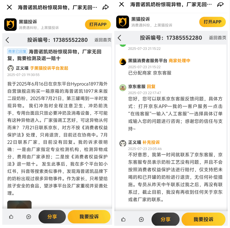 据黑猫投诉平台用户反映,该用户于2025年6月在线上平台购买的海普诺凯奶粉,在第三罐喝到一半时发现异物,联系京东客服,仅把未喝完的奶粉进行了退货,无补偿。