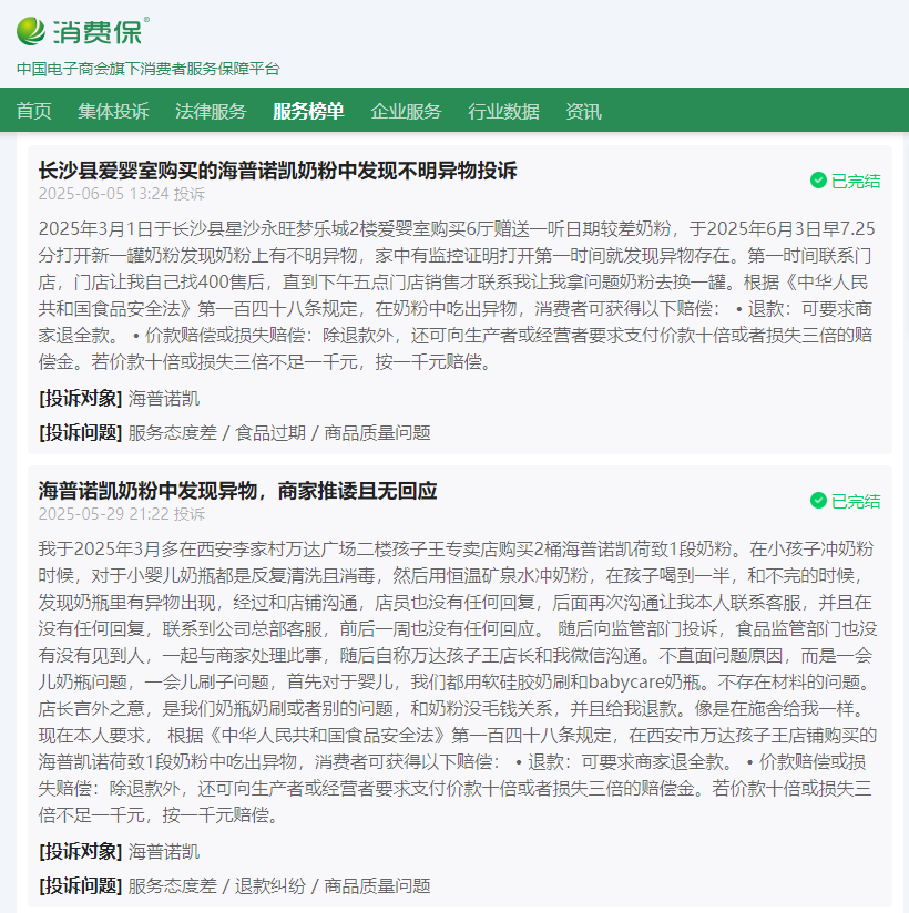 据消费保消息,在2025年5月、6月均有消费者反馈奶粉中发现不明异物问题,处理结果是换新或退款,同样未根据法律相关要求进行额外赔偿。