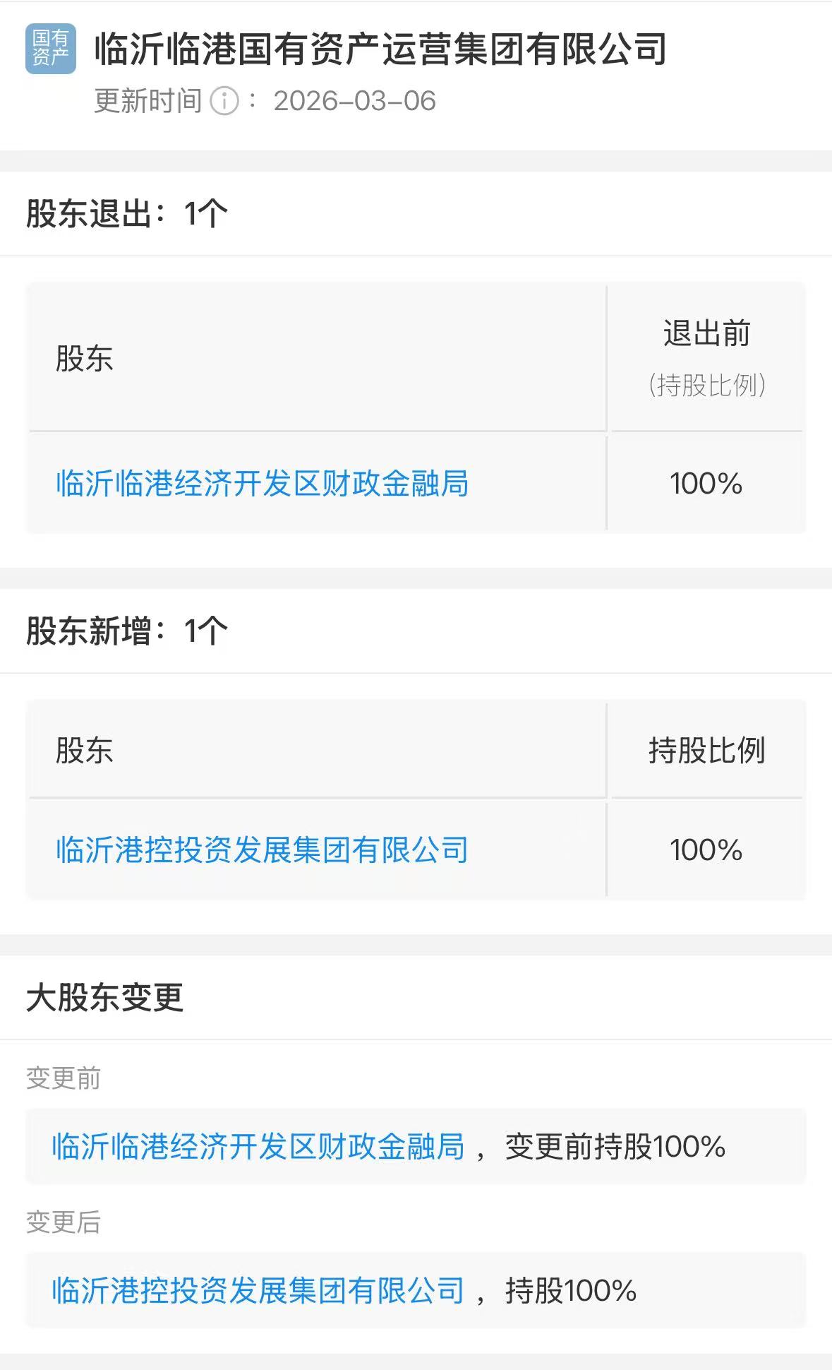 近日,临沂临港国有资产运营集团有限公司(下称“临沂临港国资集团”)股东发生变更,原全资股东临沂临港经济开发区财政金融局退出,由其全资子公司临沂港控投资发展集团有限公司(下称“港控投资”)100%接盘。