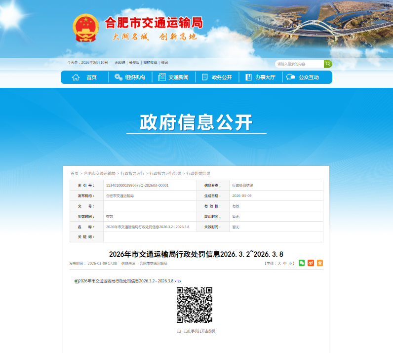 齐鲁晚报·齐鲁壹点记者于合肥市交通运输局政府信息公开栏获悉,3月9日,安徽建工(600502.SH)旗下的安徽建工建设投资集团设备安装有限责任公司(下称“安徽建工建投设备安装公司”)因违反《公路水运工程质量监督管理规定》相关规定,收到合肥市交通运输局罚单。