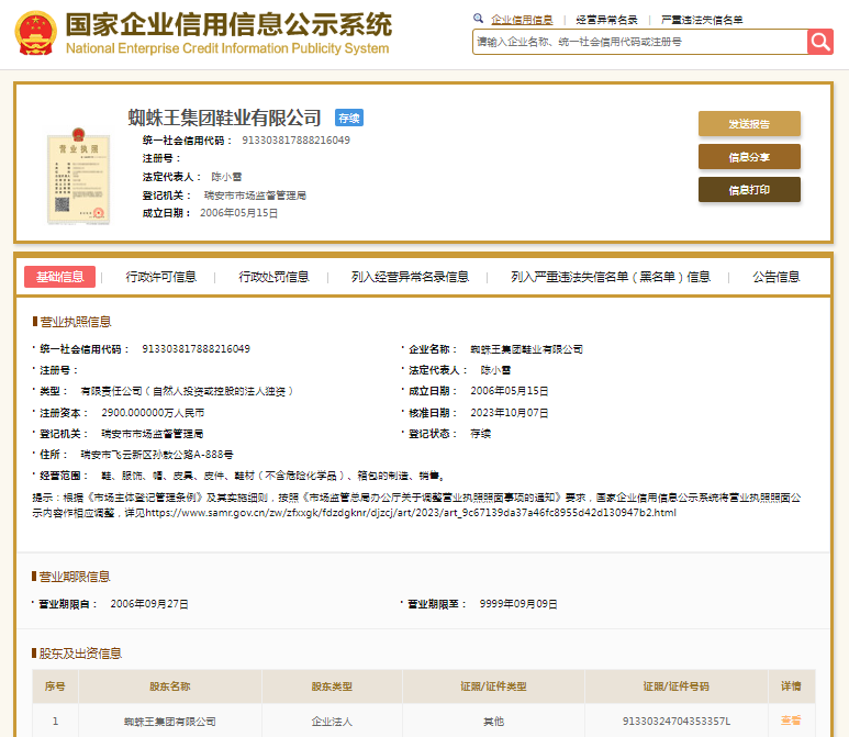 国家企业信用信息公示系统显示,蜘蛛王集团鞋业有限公司成立于2006年,注册资本2900万元人民币,法定代表人为陈小雷,由蜘蛛王集团有限公司全资持股。蜘蛛王集团有限公司则成立于1996年,注册资本18000万元人民币,法定代表人为许乔程。