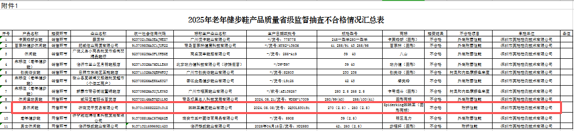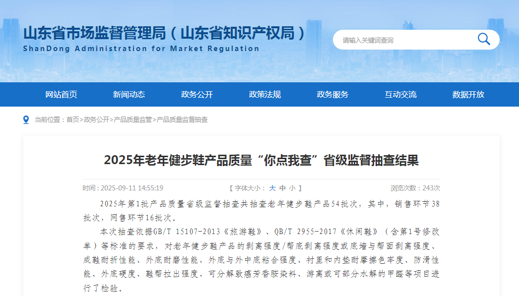 齐鲁晚报·齐鲁壹点记者注意到,2025年9月11日,山东省市场监督管理局发布2025年老年健步鞋产品质量“你点我查”省级监督抽查结果,抽查中发现,54批次老年健步鞋中有11批次不合格,其中,蜘蛛王鞋业上榜。其不合格产品为男休闲鞋,生产日期及货号:2024.05.08/2Q30L530191,规格型号270(2.5)、260(2.5),不合格项目是耐折性能。