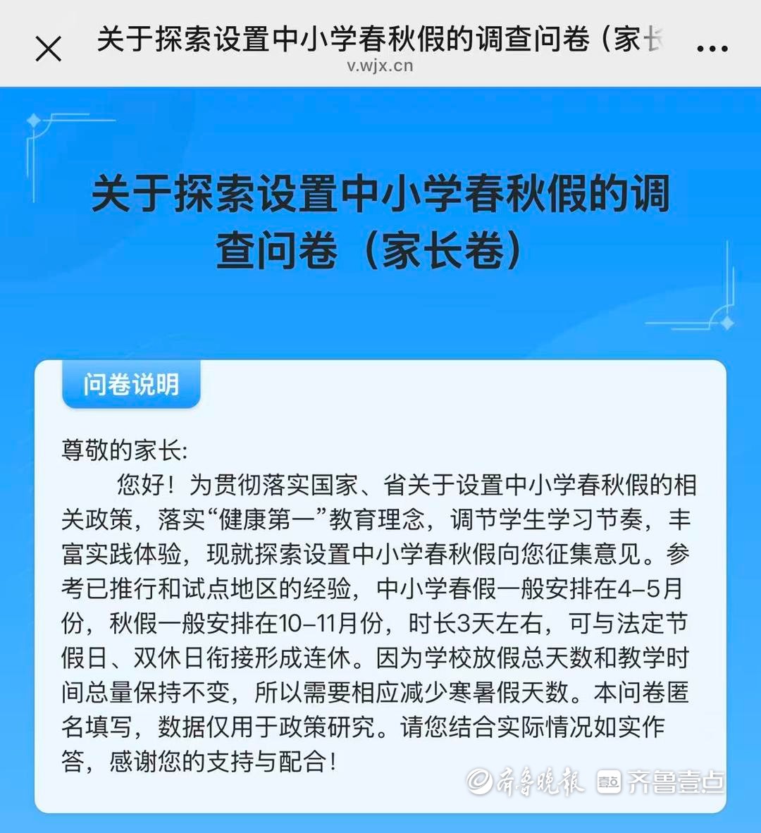 目前,山东省教育厅及烟台市教育局尚未就此事发布正式公告。但这份飞入家长手中的问卷,无疑已释放出强烈信号:中小学春秋假,或许离烟台乃至山东的孩子们不远了。