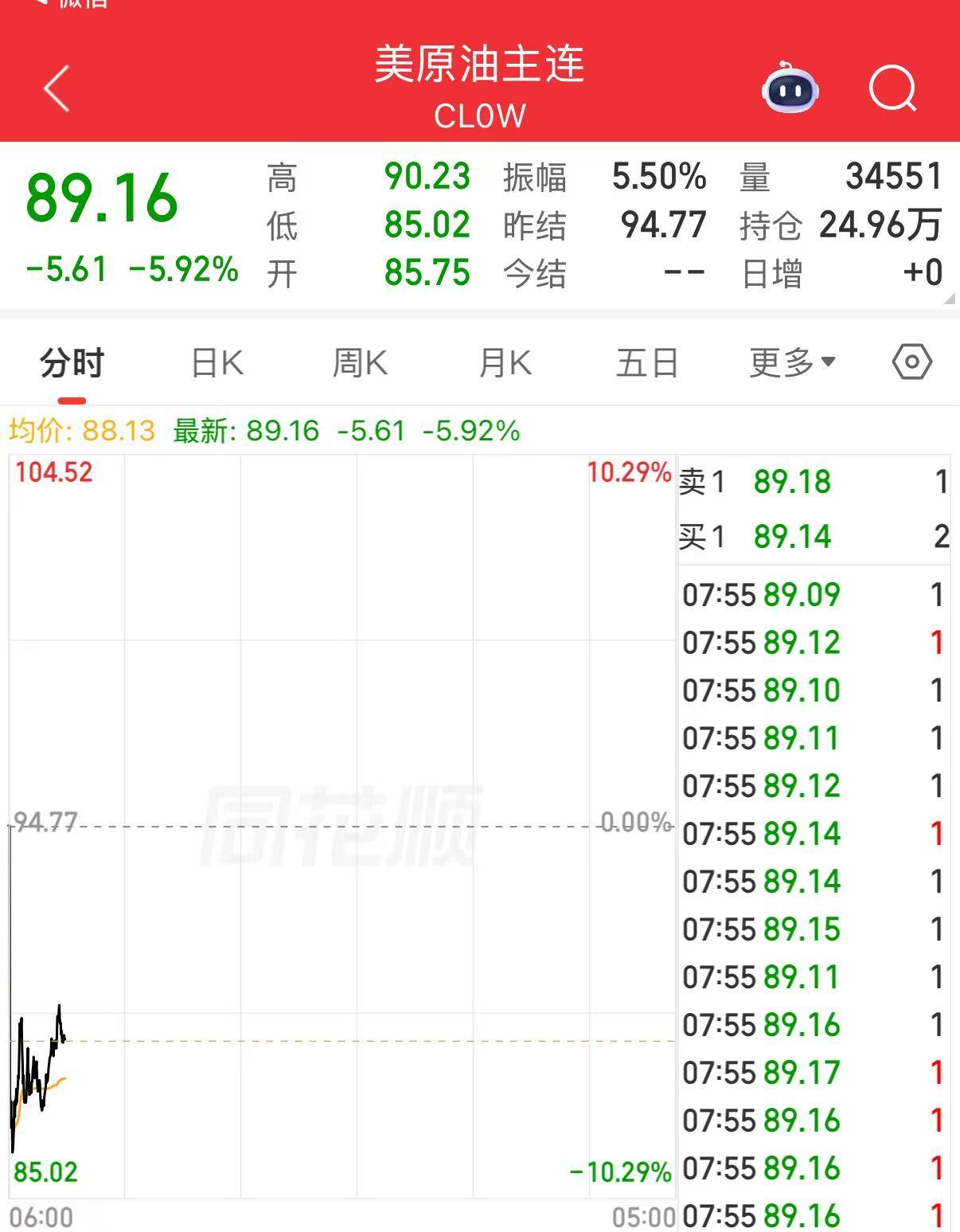 受避险情绪快速降温影响,国际油价大幅回落。布伦特原油收于98.96美元/桶,盘后跌破90美元;WTI原油收于94.77美元/桶,亚洲交易时段开盘下跌10%,报85.52美元/桶。