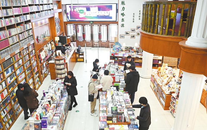 坐落于哈尔滨市中央大街上的中央书店,为百年老街增添了氤氲书香和文化底蕴。图为3月9日,读者在阅读、选购图书。 《黑龙江日报》纪勇 摄