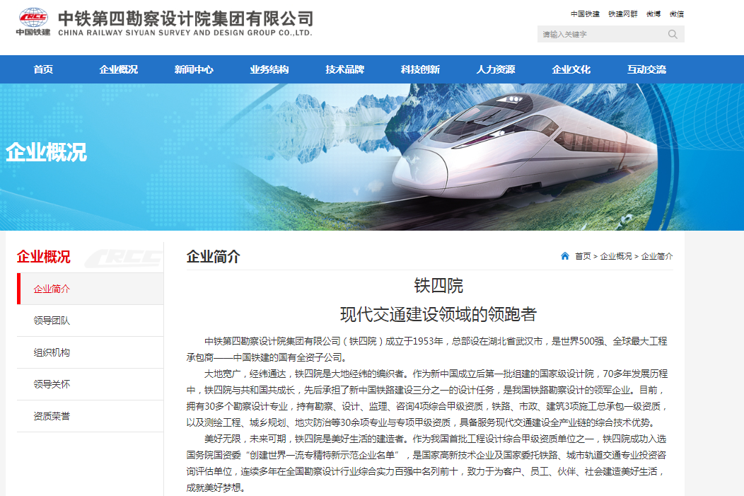 据其母公司——铁四院官网介绍,铁四院总部设在湖北省武汉市,是世界500强、全球最大工程承包商——中国铁建的国有全资子公司,是我国铁路勘察设计的领军企业。目前,公司拥有30多个勘察设计专业,持有勘察、设计、监理、咨询4项综合甲级资质,铁路、市政、建筑3项施工总承包一级资质,以及测绘工程、城乡规划、地灾防治等30余项专业与专项甲级资质。