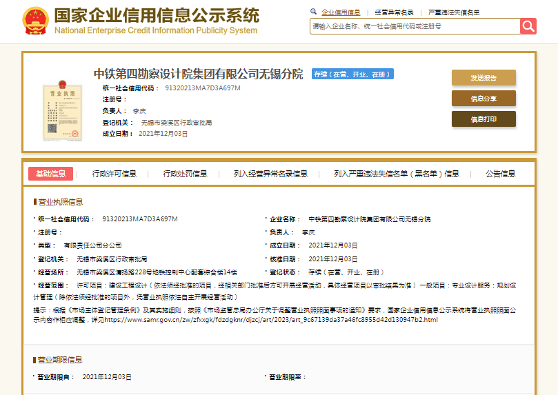 国家企业信用信息公示系统显示,中铁第四勘察设计院集团有限公司无锡分院成立于2021年,负责人李庆。其母公司中铁第四勘察设计院集团有限公司成立于1992年,注册资本105250万元人民币,法定代表人光振雄,由中国铁建(601186.SH/01186.HK)全资持股。