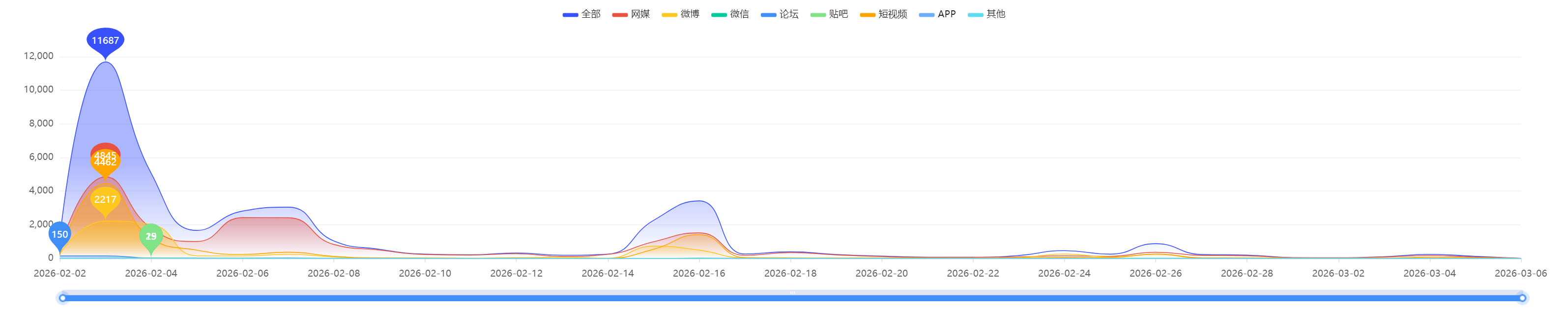 事件传播过程中,监测评论信息37719条。评论量最高峰出现在2026年02月03日,共产生11687条信息,其中网媒平台最为突出。