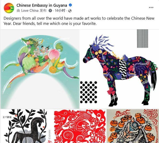 在圭亚那,中国驻圭大使馆通过Facebook平台发布展览图片,以“线上”的方式让马年生肖设计作品走进当地民众视野,吸引了众多网友广泛关注与互动留言,拉近了中圭两国人民的情感距离,助力人文交流走深走实。