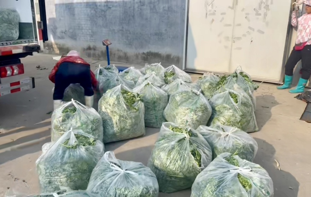 从5时到7时的两个小时里,一袋袋肥厚叶片被提出了大棚,逐一过磅称重,随后搬上一辆挂着河北牌照的蔬菜运输车。