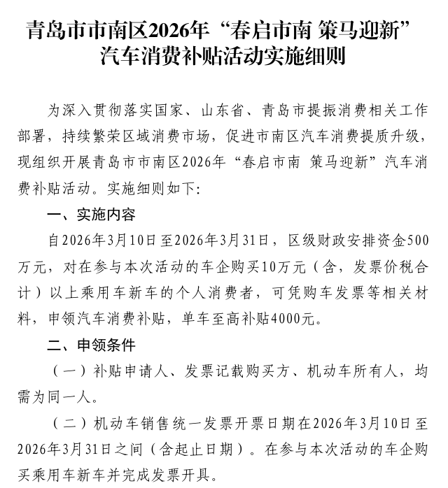 3月青岛车市再添利好!3月9日晚,市南区商务局官方微信发布了2026年“春启市南 策马迎新”汽车消费补贴活动公告。根据活动实施细则,自2026年3月10日至2026年3月31日,该区区级财政安排资金500万元,对在参与本次活动的车企购买10万元(含,发票价税合计)以上乘用车新车的个人消费者,可凭购车发票等相关材料,申领汽车消费补贴,单车至高补贴4000元。