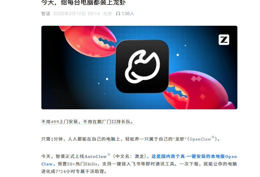 3月10日,智谱宣布正式上线AutoClaw(中文名:澳龙),用户下载安装后,可以在本地电脑上一键部署“龙虾”。据智谱介绍,AutoClaw是可实现一键安装的本地版OpenClaw“小龙虾”,预置50+热门Skills,支持一键接入飞书等即时通讯工具。