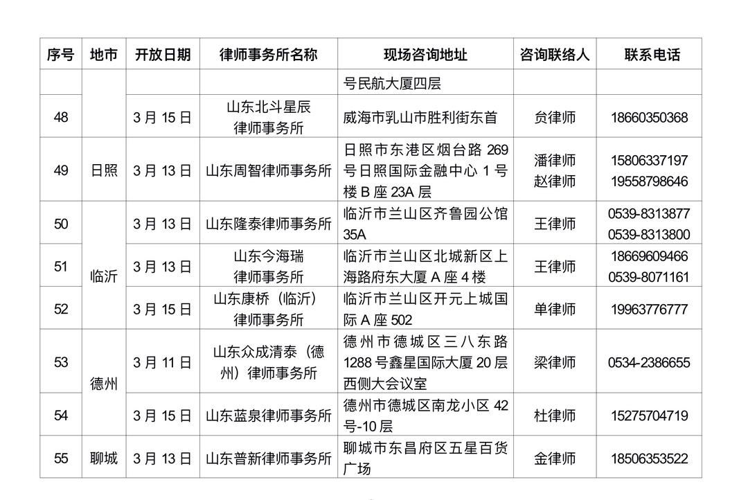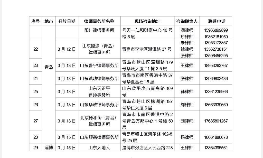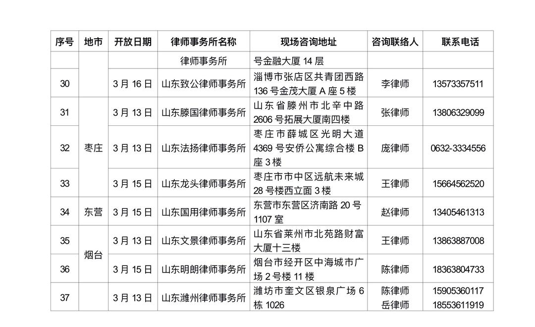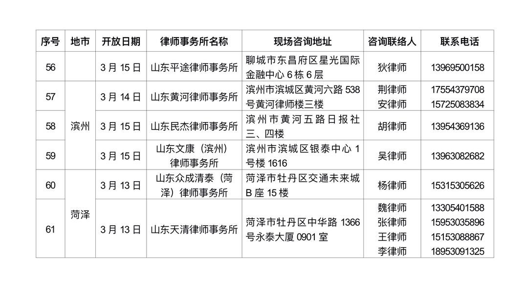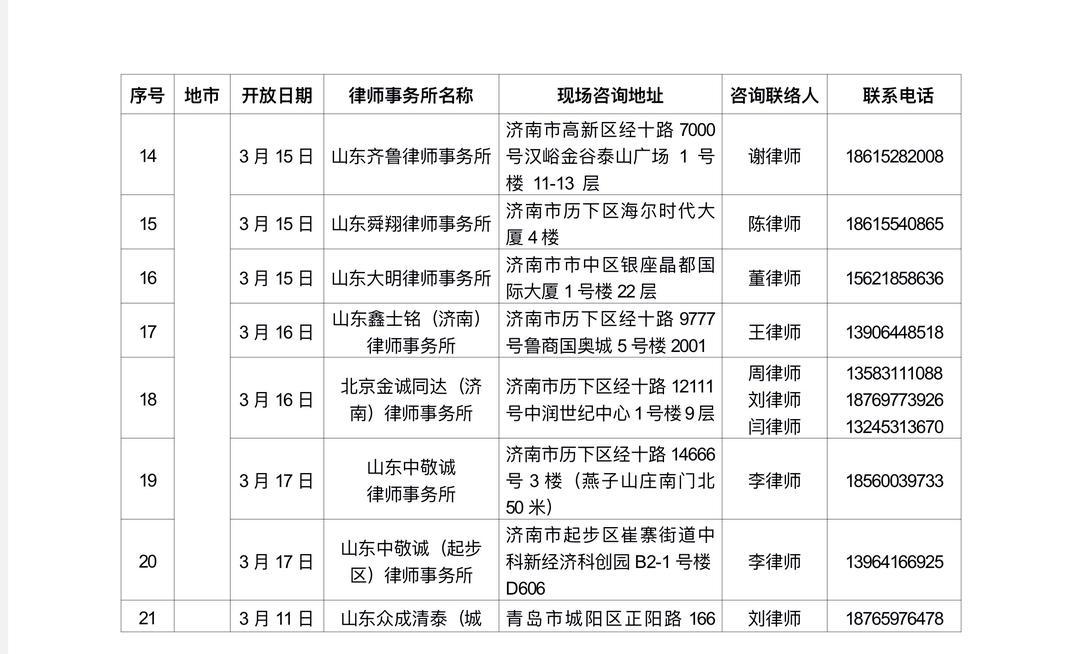 1.查询附件名单:按“地市”筛选就近律所,查阅其开放日期、现场地址、联系电话(名单含:序号、地市、开放日期、律所名称、现场咨询地址、咨询联络人、电话)。