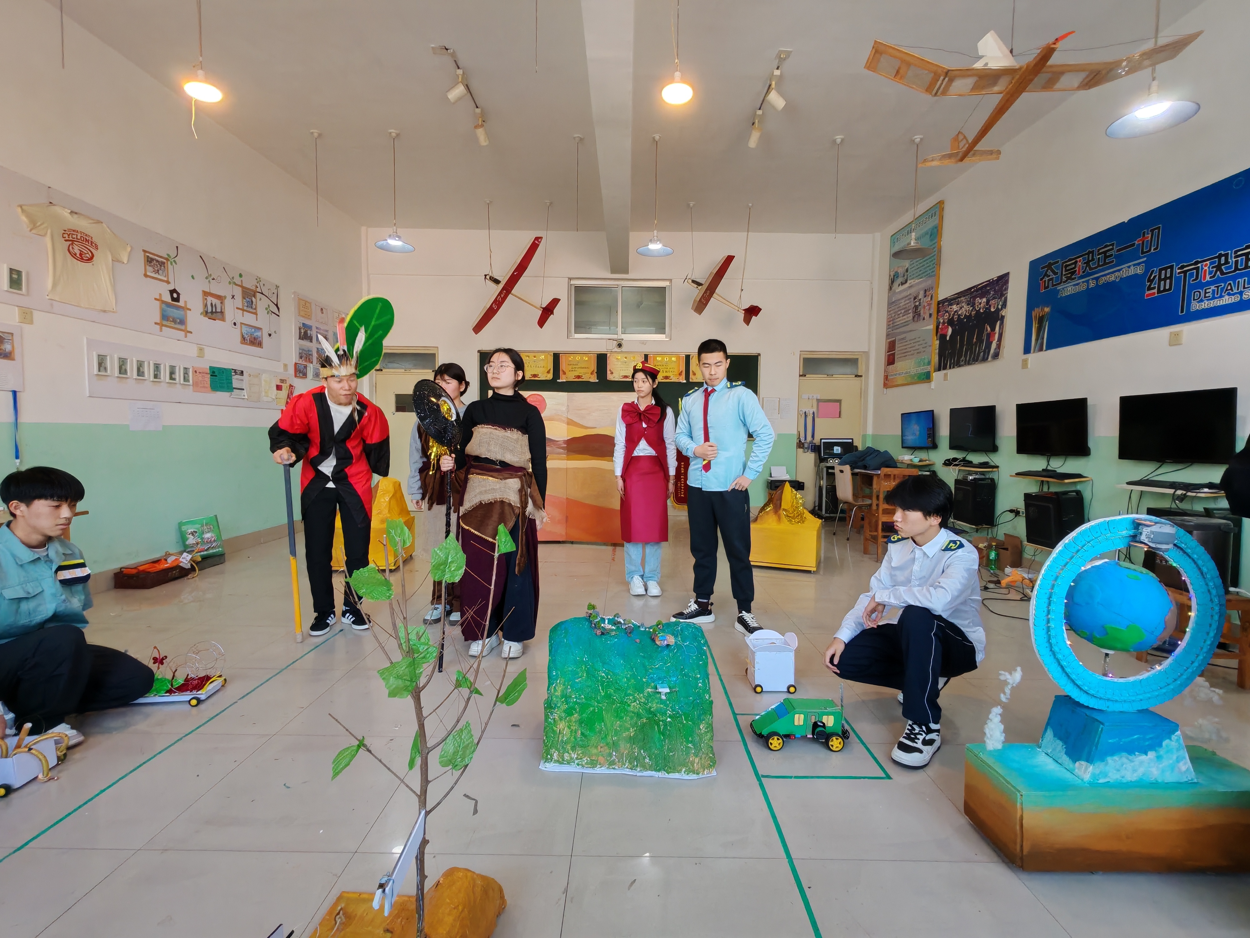 蓝天白云下,一台绿色列车带着车厢不断行进,穿过沙漠、山林、绿洲……从创意景观到动手制作,7个学生7个演员,完成剧本表演,现场完美答辩,各自施展才能,裁判满意打分。