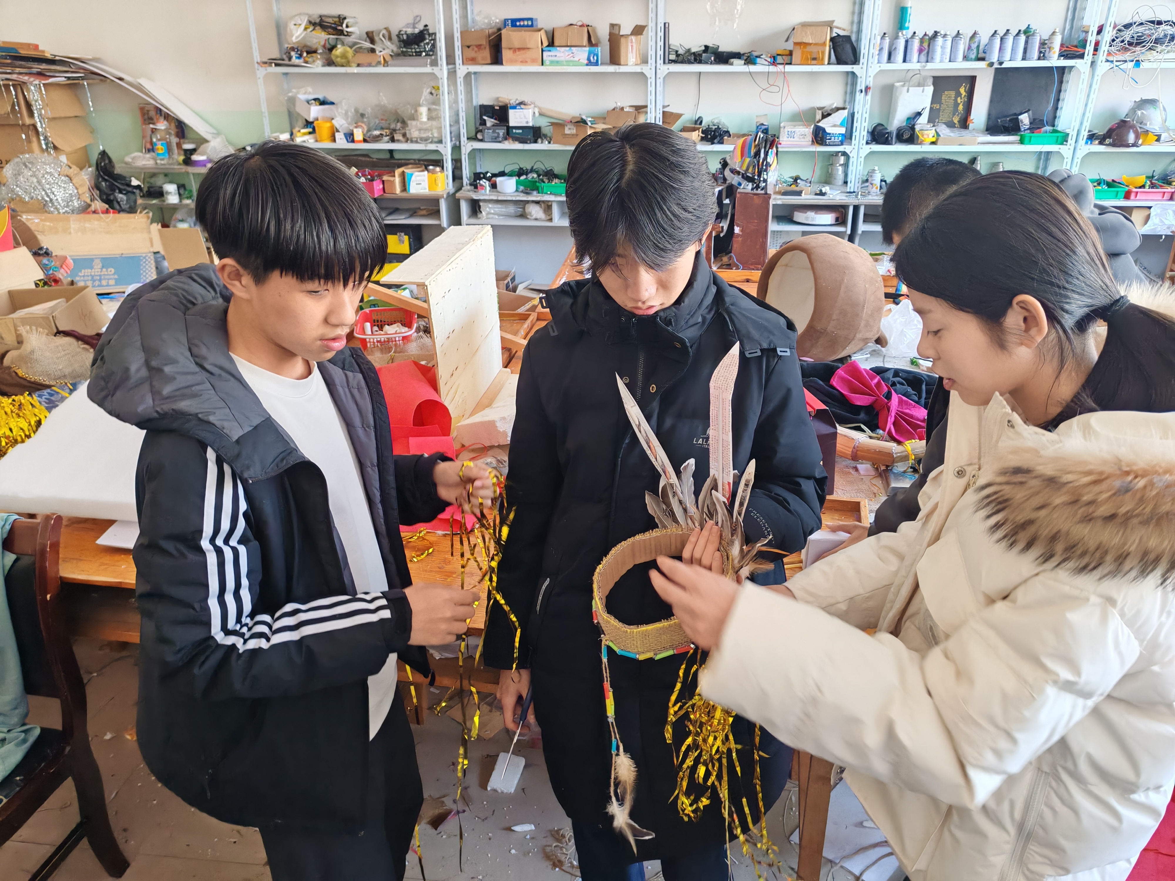 一段时间后,在指导老师招呼下,大家带着制作好的道具,又来到又一个教室。摆放好道具,穿好服装,再一次对着剧本进行排演。记者发现,对于不协调的细节,指导老师和学生们立即停住,围在一起研究修改,反复打磨排练,一直到中午午饭时间才收工。