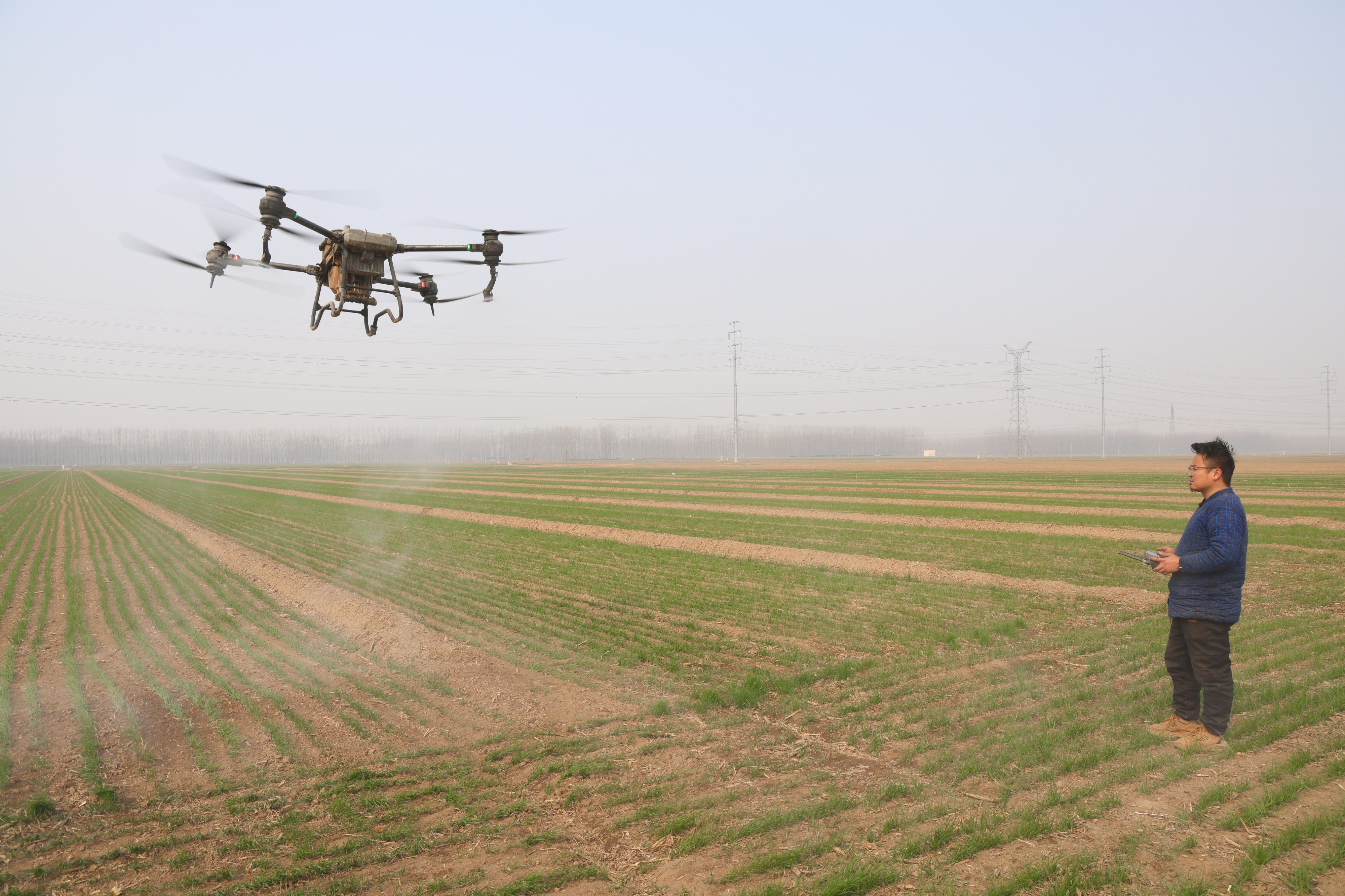 3月11日,邹平市韩店镇大白村农田里,农民操作植保无人机进行喷药作业。眼下正值小麦返青管护期,当地农民抢抓农时,强化麦田科技管理,利用植保无人机、自走式高杆喷雾机对小麦进行田间管理作业,提高春管效率,促进稳产增收。(大众新闻记者韩凯通讯员霍广毕文丽报道)