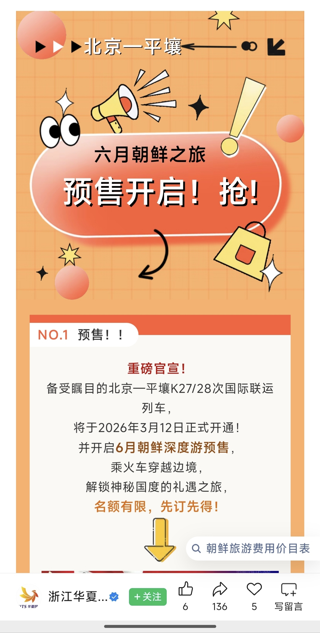 极目新闻记者注意到,因中朝列车重新开通,已有不少旅行社推出预订“朝鲜7日游”跟团游项目。浙江华夏国旅工作人员告诉极目新闻记者,目前可预订6月赴朝深度游7至8日游,从北京出发,若乘坐硬卧,费用为6680/人至7380/人。目前已有旅客付定金预订行程。