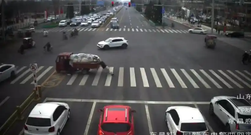 在聊城东昌西路与向阳路丁字路口,一辆满载货物的三轮车突发故障停在斑马线上进退两难。