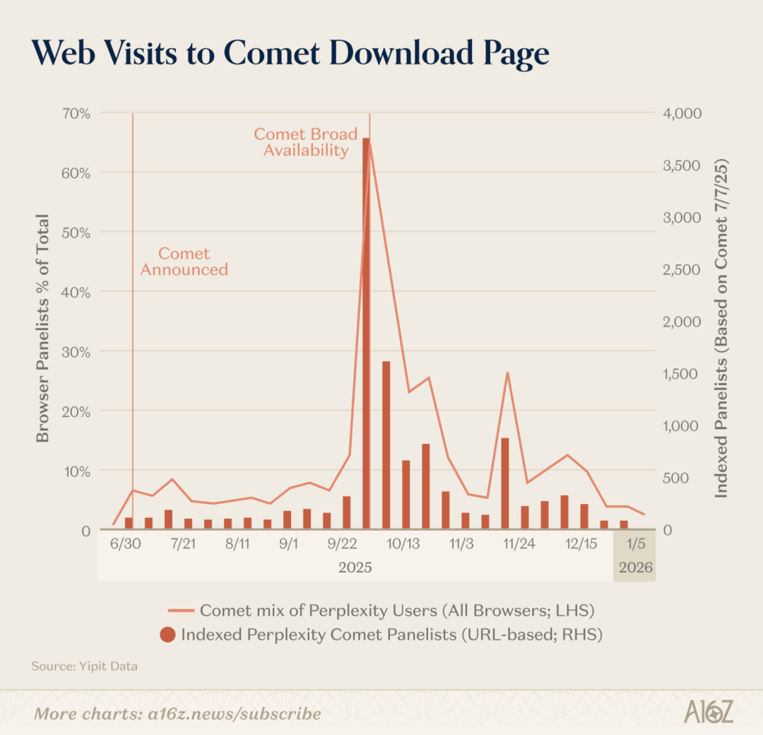 数据显示, Perplexity的Comet目前拿下了最大市场份额,但还没有哪款AI浏览器出现持续加速增长的情况 。