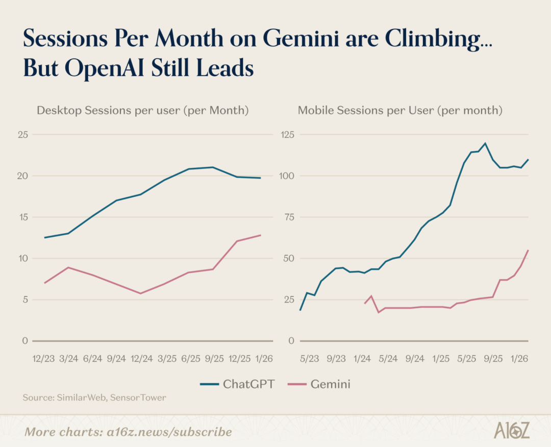 网页端,虽然Gemini的月均用户会话数正在攀升,但ChatGPT仍比它高出1.3倍;移动端,ChatGPT则以2.2倍的月均用户会话数遥遥领先。