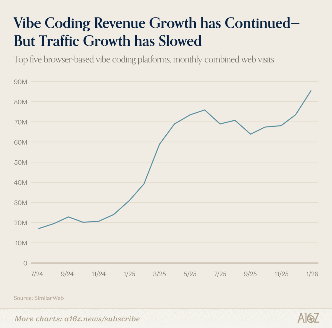 发展到目前,最初呈现爆发式增长的前五大vibe coding平台已经增速放缓。