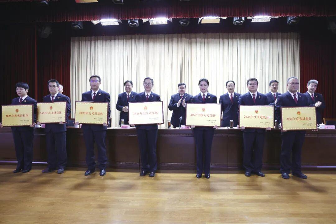 会上对东营市人民检察院2025年度先进集体进行通报表扬并颁发奖牌。会议以视频形式开至基层院,市县两级院全体检察干警参加会议。