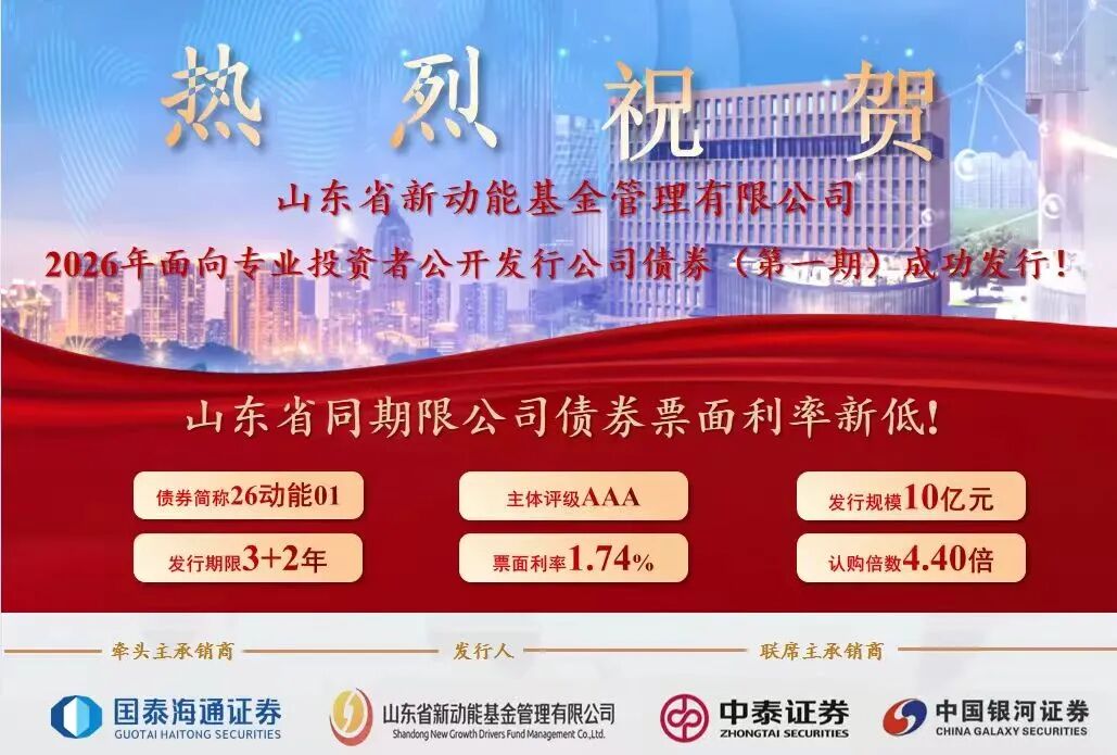 记者从山东省新动能基金管理有限公司(以下简称“新动能基金公司”)获悉,该公司近日成功发行2026年第一期公司债券,发行规模10亿元,期限3+2年,认购倍数4.4倍,票面利率1.74%,为山东省同期限公司债券历史最低利率。