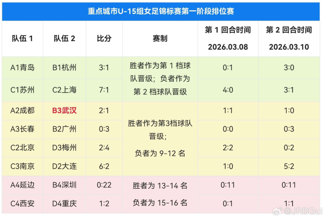 2026年中国足协青少年足球锦标赛(重点城市女子U15组)第一阶段排位赛进行。青岛U15女队0-1和3-0两回合总比分3-1战胜杭州U15女队,以第一档身份晋级第二阶段,第二阶段比赛预计在2026年7月进行。