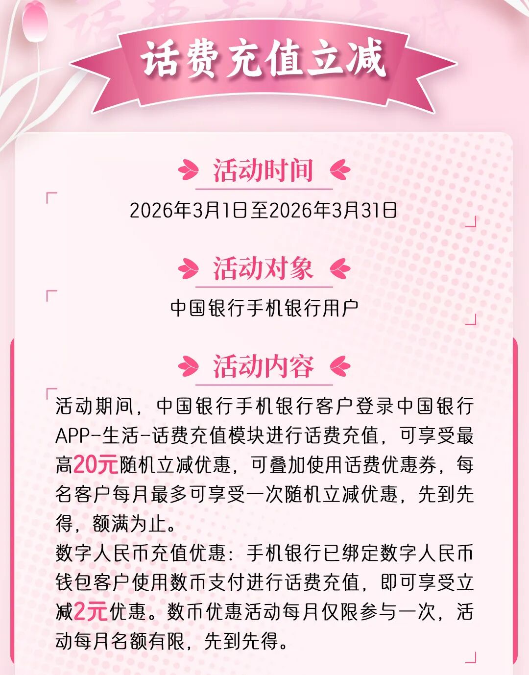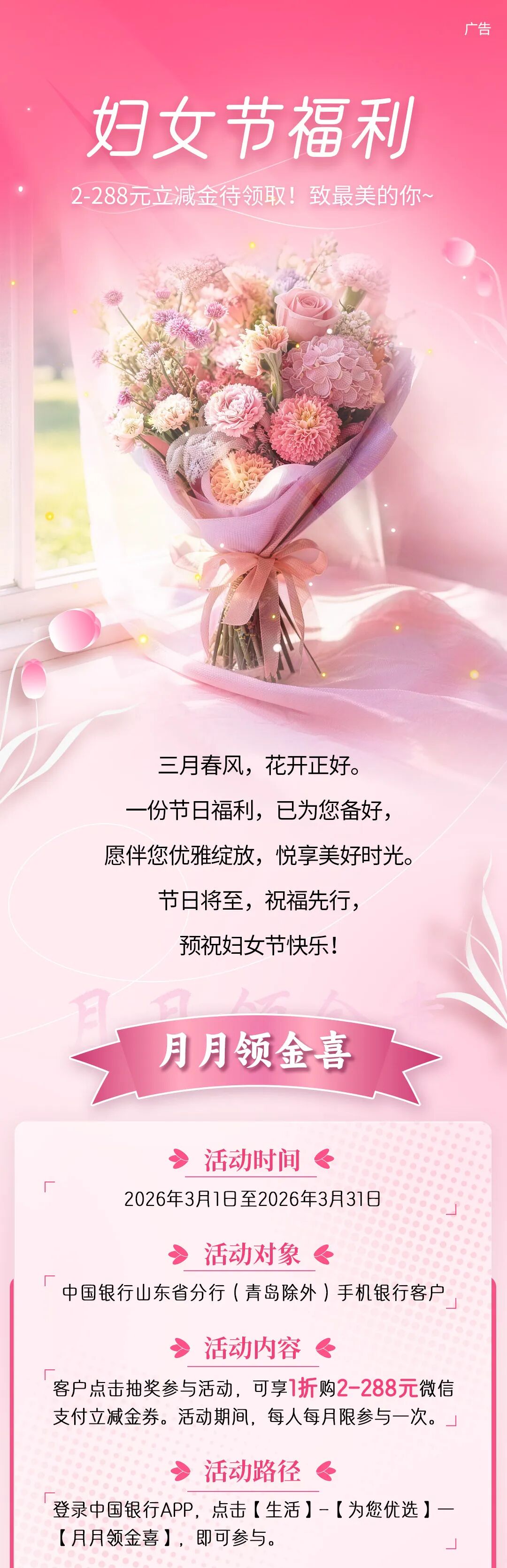中国银行泰安分行:2-288元立减金待领取!致最美的你~大众报业·齐鲁壹点 2026-03-12 14:18:53(中国银行微银行山东省分行)(齐鲁晚报·齐鲁壹点客户端欢迎各界投稿,提供线索,包括文字、照片、短视频。泰安新闻素材请联系齐鲁晚报泰安融媒中心,热线电话:0538-6982110。)责任编辑:赵晴