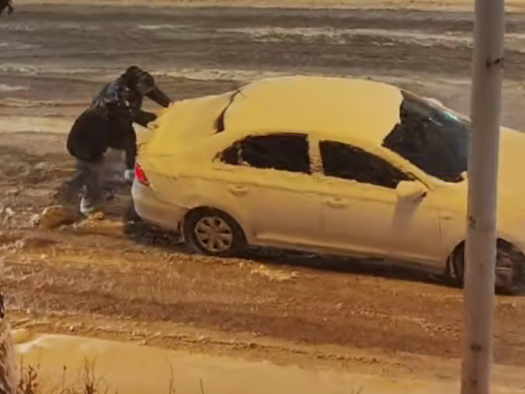 3月11日傍晚时分,在沙依巴克区平顶山街道平顶山东一路口大坡处,不少车辆因路面湿滑无法行驶、原地打滑造成交通拥堵,平顶山街道工作人员主动作为,组织周围行人一起推车,助力道路恢复通行。