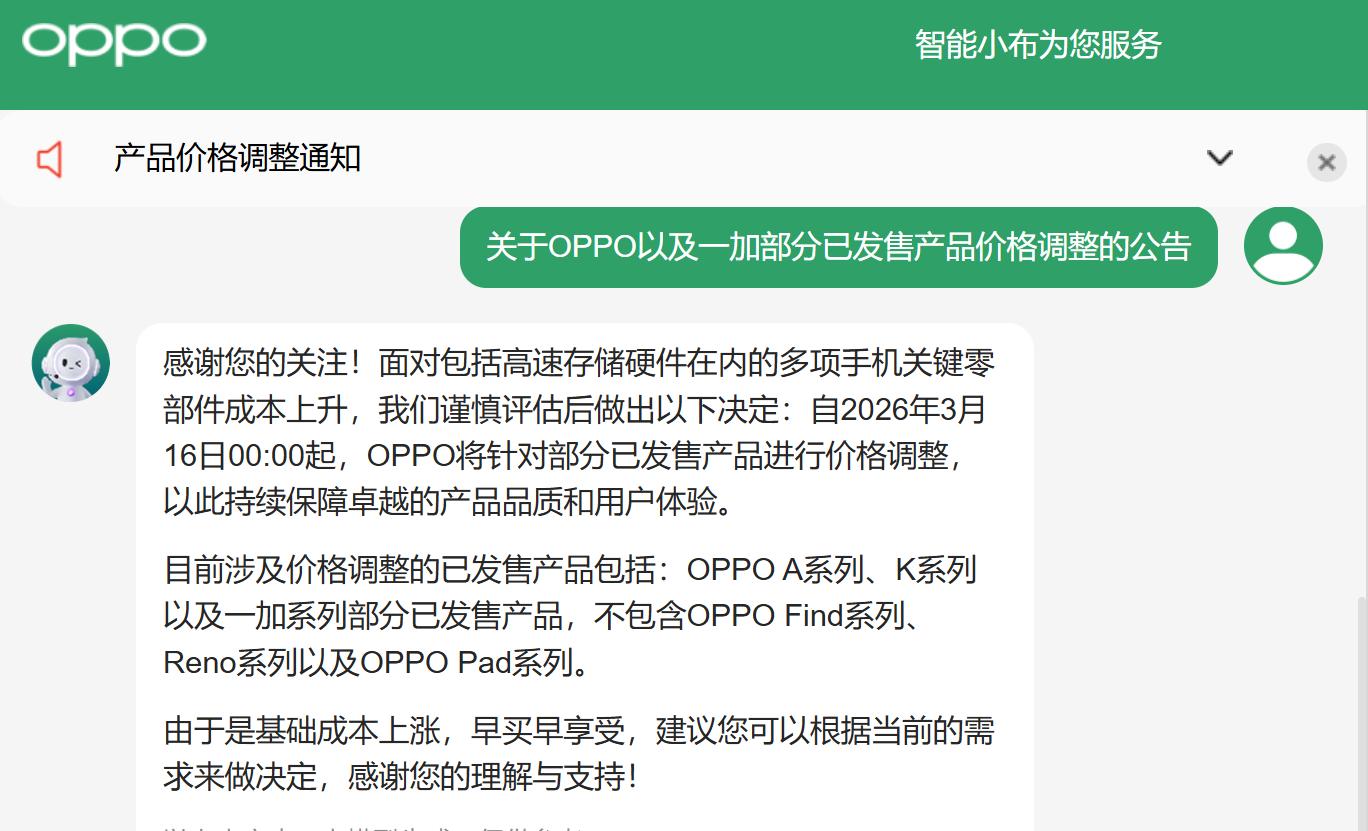 日前,OPPO宣布,自3月16日起,将针对部分已发售产品进行价格调整,涉及OPPO A系列、K系列以及一加部分已发售产品。OPPO方面称,价格调整系基础成本上涨。