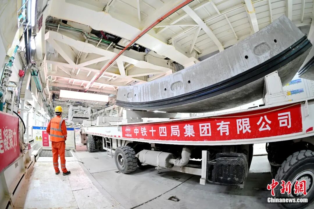 图为工人在进行隧道管片的吊运作业。张孝鹏 摄