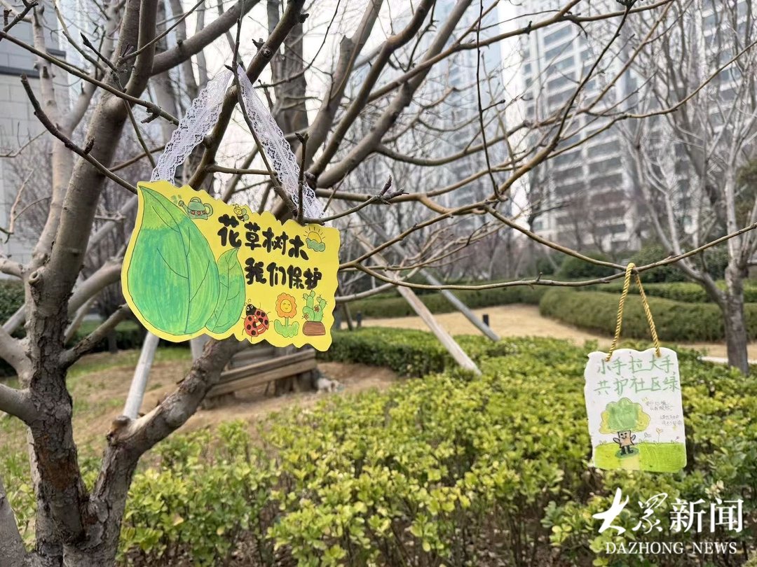 在社区工作人员和老师的带领下,孩子们来到社区绿化带,踮起脚尖,将一张张色彩斑斓的爱心卡轻轻挂在嫩绿的小树枝头。爱心卡随风轻轻摆动,与新发的嫩芽、翠绿的枝叶相映成趣。