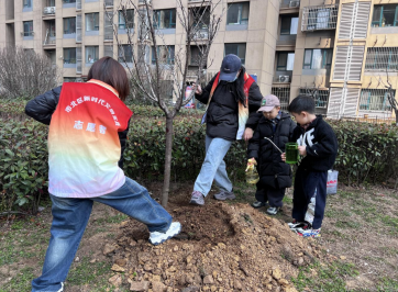 活动现场暖意融融、忙碌有序,一派生机勃勃的春日景象。在志愿者们的下帮助,孩子们分工协作、干劲十足,挥锹铲土、扶苗填坑、提水浇灌、踩实培土,将一棵棵充满生机和希望的树苗植入地里,每一个步骤都认真细致、有条不紊。经过大家一番辛勤劳作,一株株新苗稳稳扎根沃土、迎风挺立,为春日的社区增添了一抹鲜活的绿意,也寄托了大家守护生态、共建美好家园的心愿。