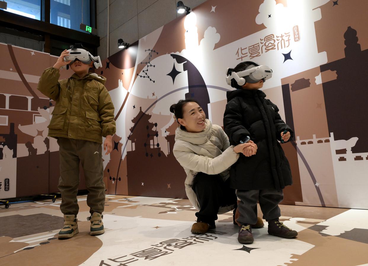 1月3日,小观众在中国考古博物馆“华夏漫游”互动项目区使用VR设备观看北京中轴线场景介绍。新华社记者 李贺 摄