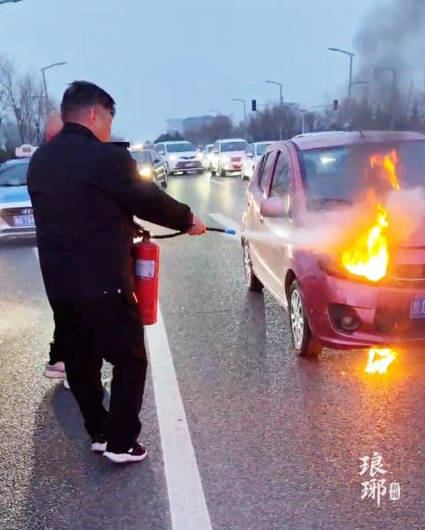 路遇汽车起火,临沂公交司机拎起灭火器就冲了上去