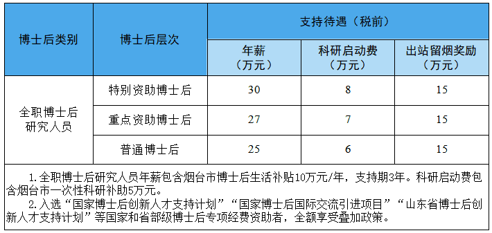 1.在烟台市辖区(含芝罘区、莱山区、福山区、开发区、高新区、蓬莱区)内无住房的全职博士后,在站工作期间,鲁东大学协助其申请烟台市人才公寓,也可向鲁东大学申请暂住房一套。