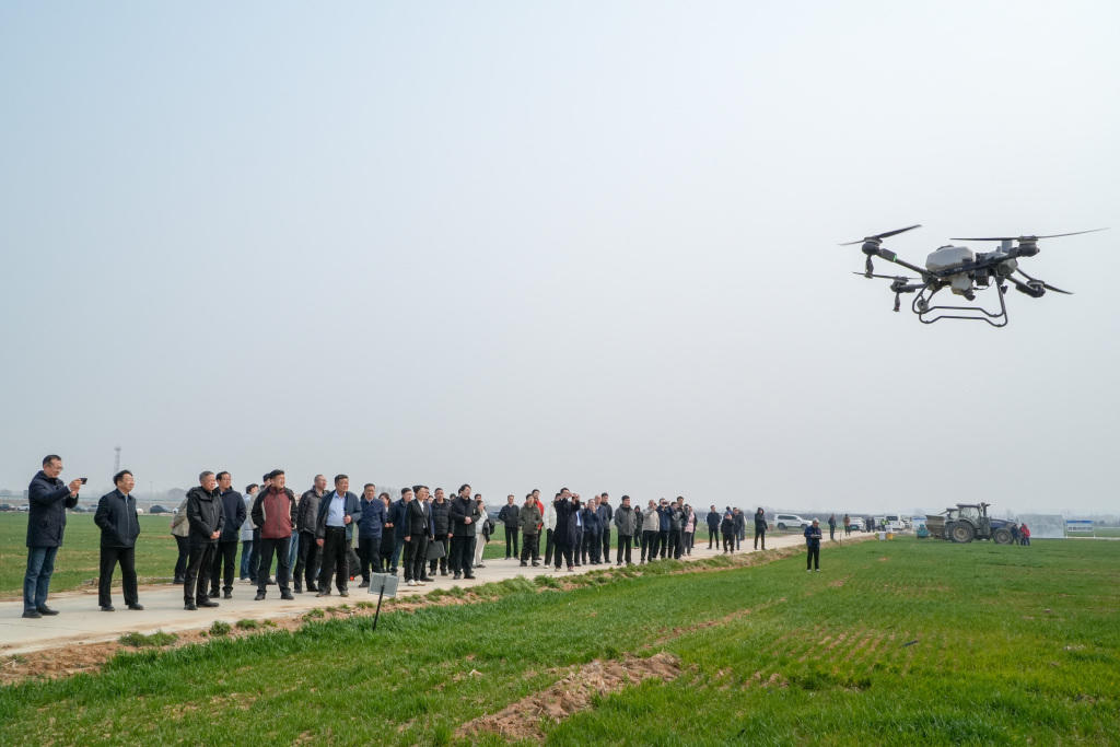 话音刚落,一台自走式撒肥机驶入麦田,均匀撒下颗粒肥,不到10分钟便完成一亩地的追肥作业。紧接着,植保无人机腾空而起,在麦田上空来回穿梭,喷出细密的水雾。“这是‘一喷三防’作业演示,一次喷药就能防治病虫害、防干热风、防倒伏。”技术人员手持遥控器现场讲解,一旁的展板上,小麦茎基腐病防控技术要点清晰明了。种粮户们纷纷掏出手机拍照记录,嘴里念叨着:“这下心里有底了。”