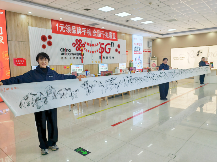 “不是亲人,胜似亲人。”这份信任感,在日复一日的陪伴中愈发厚重。一次偶然的聊天得知生笙属马今年刚好是本命年,李奶奶悄悄记在了心里。为此,她亲自执笔,耗时三个月,一笔一画勾勒出十一米长卷“百骏图”,并专程送到生笙手中。当生笙接过这幅凝聚着心血的画卷时,眼眶瞬间红了,营业厅的小伙伴们小心翼翼地展开画卷,只见画卷上的百匹骏马形态各异、栩栩如生:有的俯首吃草,神态悠然;有的侧首沉思,温婉灵动;有的奋蹄奔腾,意气风发;有的两两相望,温情脉脉。每一笔线条都饱含着老人对生活的热爱,每一抹色彩都装满了对生笙的谢意与祝福,更藏着客户对联通服务最真挚、最厚重的认可与肯定。