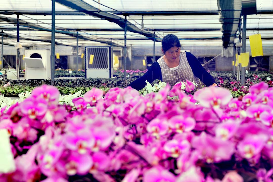 大棚里,粉白、玫红的蝴蝶兰亭亭玉立,工人们分工有序——有的给幼苗换盆,有的为盛开的花枝塑形。来自窦楼村的张艳玲正打理着一株“满天红”蝴蝶兰,她笑着说:“中午管饭,一个月3000多块,在家门口就能挣钱,还能照顾老人孩子。”