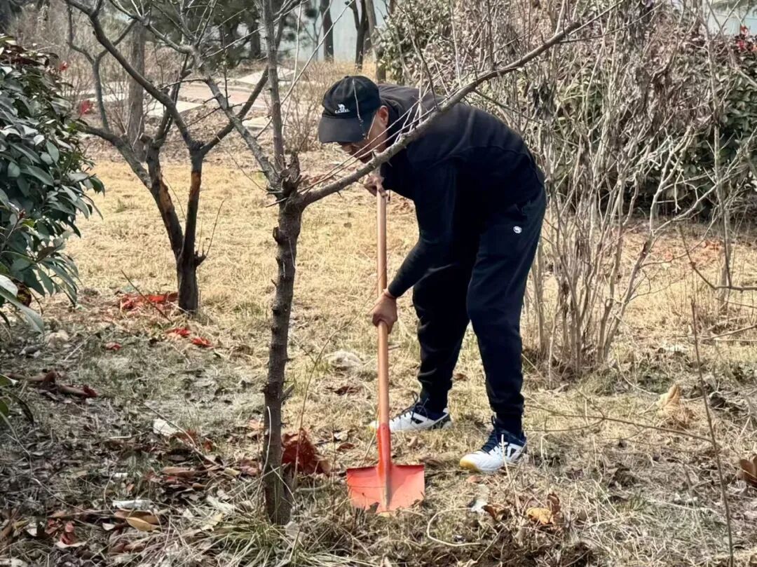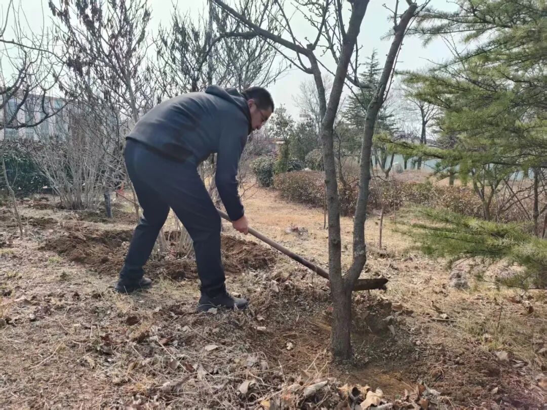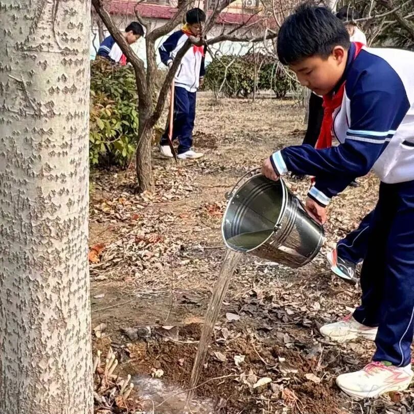 活动中,队员们分组开展松土围坑、浇水养护、悬挂护绿宣传卡片等工作,还主动整理清洗劳动工具、捡拾校园垃圾,清理卫生死角,展现出良好的精神风貌。活动最后,全体志愿者在养护的树木旁合影留念,定格劳动瞬间。