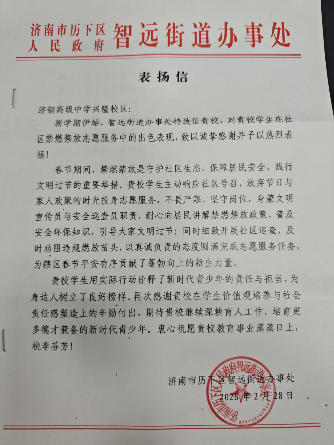 爆竹声中辞旧岁,志愿服务暖人心。在2026年春节期间,山东省济钢高级中学一批学子主动响应学校及街道号召,化身社区“安全卫士”,投身禁燃禁放志愿服务一线,用脚步丈量责任,用行动温暖邻里,收获了济南市历下区智远街道办事处的书面表扬与诚挚感谢。