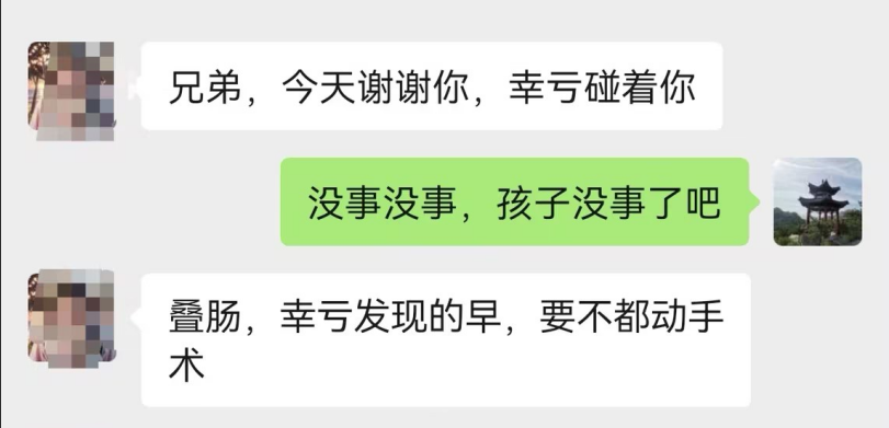 下午,苗琳琳收到了婴儿父亲发来的信息:“兄弟,今天真的太感谢你了,幸亏遇上了你们……”同时,还带来了好消息,经医生诊断,婴儿患的是肠套叠,所幸送医及时,无需手术,通过保守治疗即可痊愈。听到这个消息,苗琳琳等人悬着的心才放了下来。